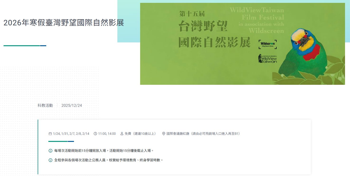 臺灣野望國際自然影展,由目前世界最大自然影展-Wildscreen 影展的得獎或入圍作品中挑選世界級的頂尖作品,引進臺灣進行中文翻譯並邀請專家審定,確保影片品質及內容正確性。本館於115年寒假期間辦理臺灣野望國際自然影展活動,提供大眾更寬廣的自然環境視野,並且掌握全球自然環境的脈動,達到推動大眾自然科學教育的目標,增進博物館輔助社會教育的功能。